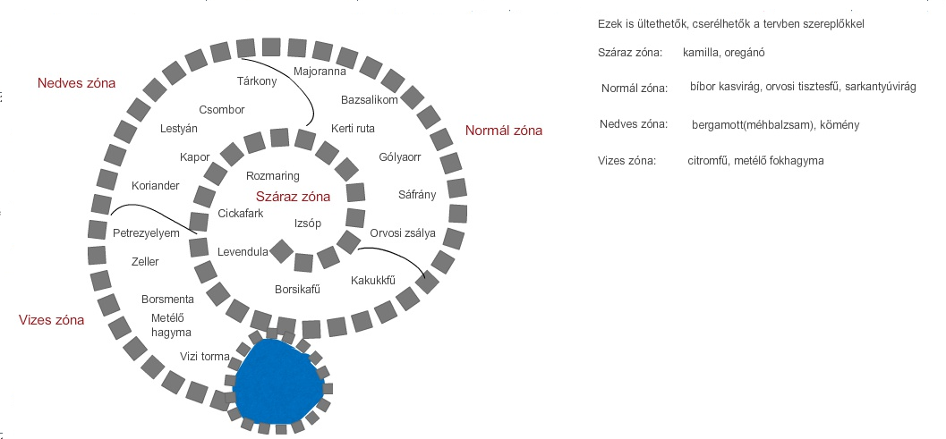 A gyógy - és fűszernövények jelenléte hasznos számunkra és a kertünk élővilágának is. Élvezhetjük ízüket, szépségüket és gyógyhatásukat. Amennyiben csak itt tervezel ültetni, úgy a nedves területen egy-egy paprikát, vagy paradicsomot is elhelyezhetsz. Itt is, (mint minden magaságyásban) praktikus az alacsonyra nővő fajtákat választani, esetleg szükséges lehet karóhoz rögzíteni őket. A bemutatott fűszerspirálban kedvenc növényeinket könnyen, örömmel nevelhetjük