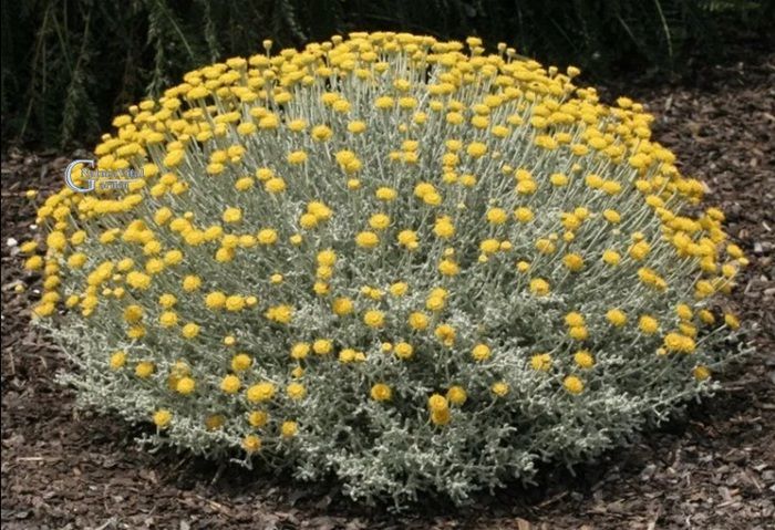 A mediterrán kertek jellemző növénye a szürke cipruska ( Santolina chamaecyparissus) egy mediterrán hangulatú szürke eminenciás növény. Csodálatosan fűszeres illatot áraszt. Sárga virágrügyek jelennek meg később az ezüstös lombozat felett. Különféle kék, lila virágokkal jól mutat.